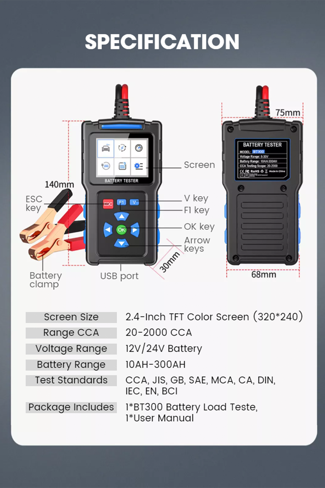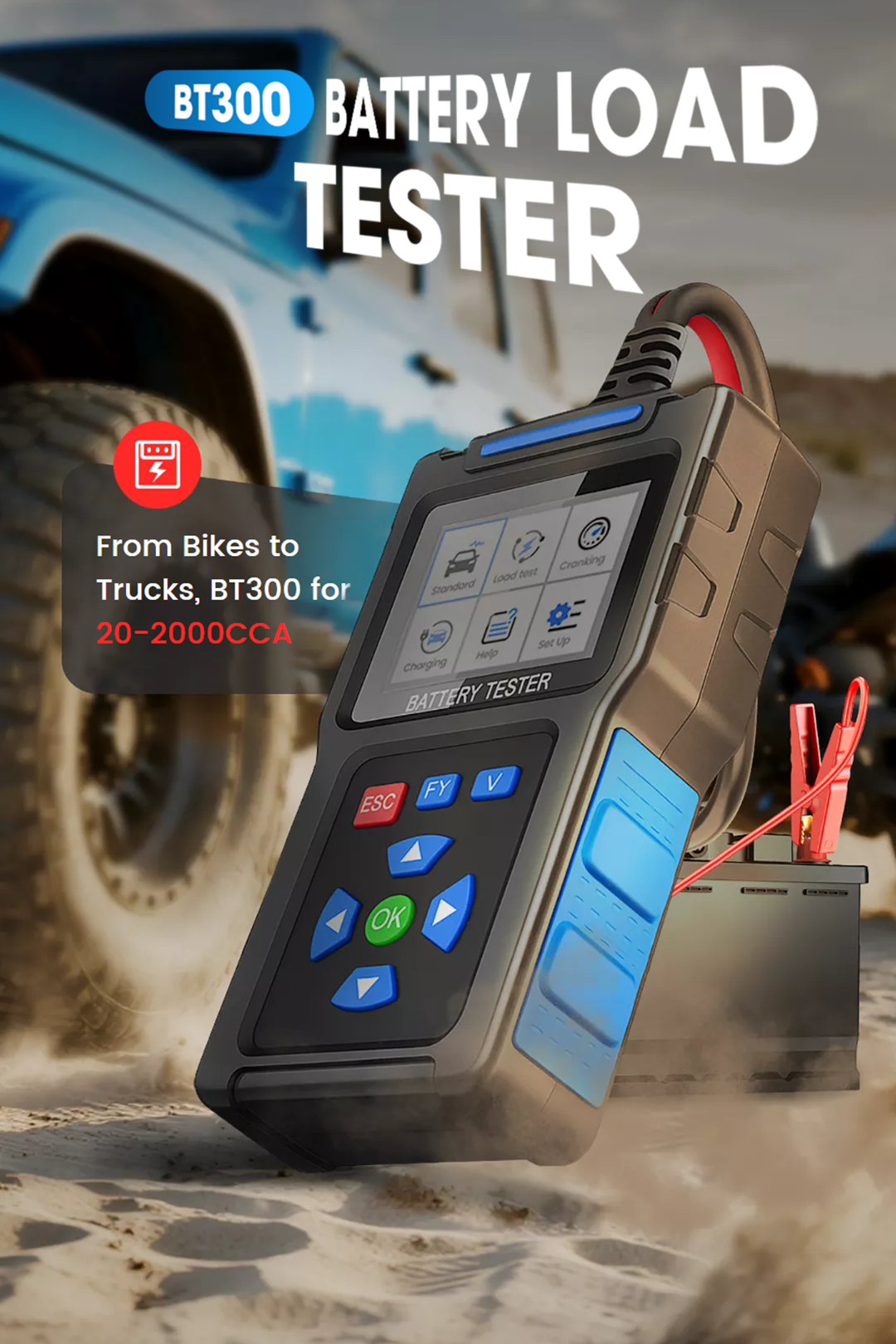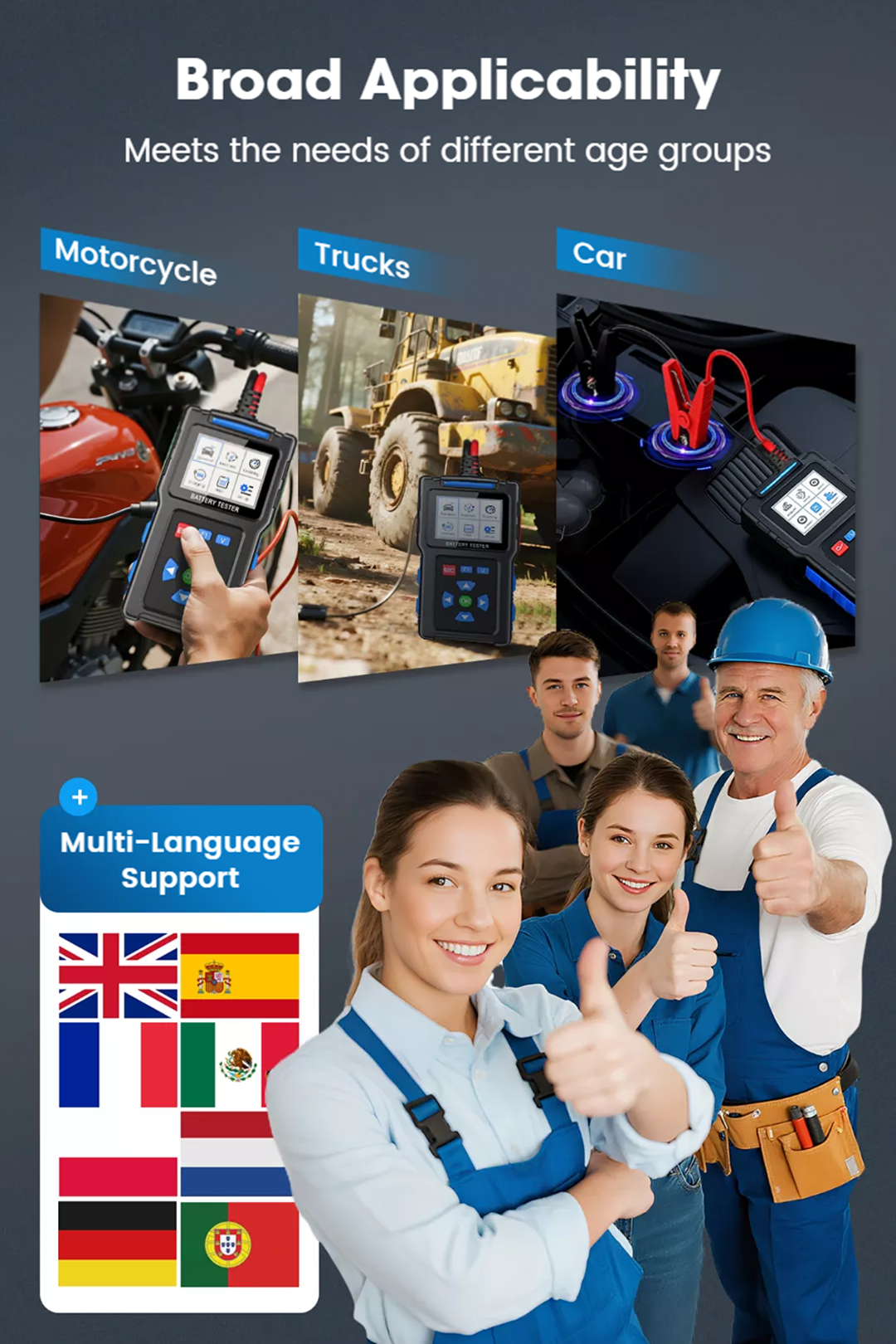 Design for 12V Batteries BT100 car battery diagnostic tester can work on all 12V 100-2000 CCA batteries including regular flooded batteries, AGM flat plate, AGM spiral, as well as GEL batteries, with multiple applications for a broad array of vehicles, Such as a car, truck, marine, boat, motorcycle and more.