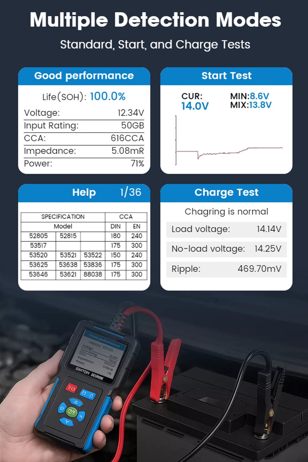 Wide Battery Coverage: works for 100 to 2000CCA regular flooded, AGM flat plate, AGM spiral, Gel, and EFB;